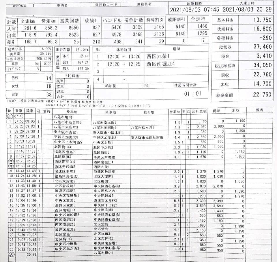 火曜日。昨日から8月31日まで大阪は緊急事態宣言が出されてる。ワンコイングループは引き続き休業も可能。他社も休業してるトコがあるので、大阪で走ってるタクシーは明らかに少ない。
