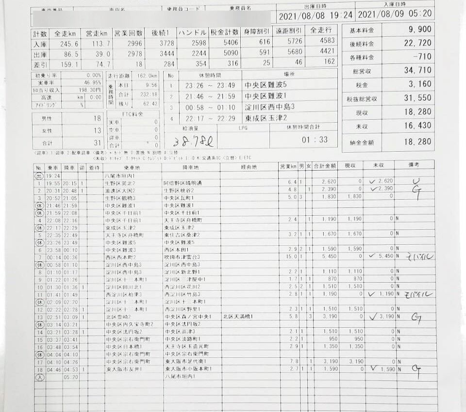 次に夜勤のツッカン。約10時間営業で18組34,710円。素晴らしい~!! 単価が高くていい営業やったみたい。ツッカンは夜勤1年目にして、だいぶ掴んでるなあ。DiDiの攻略も上手にしてる。勤務時間を毎日これぐらいにしたらだいぶカラダがラクやね。