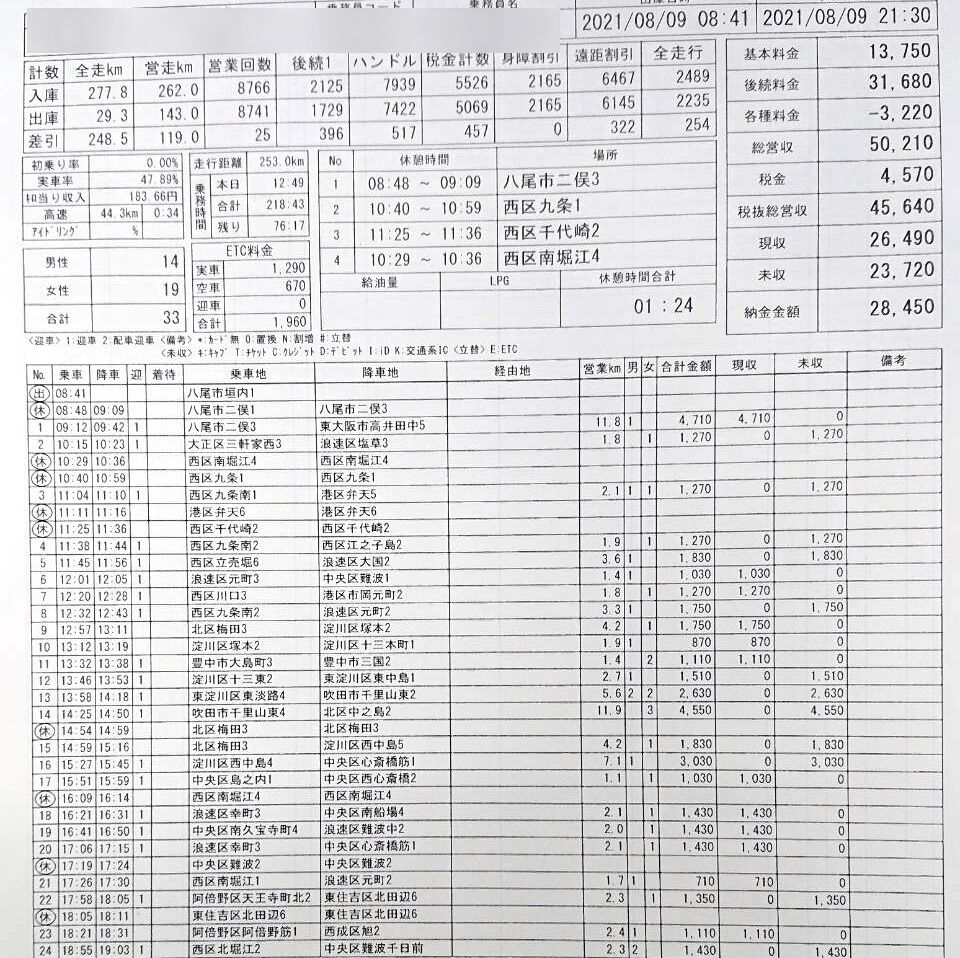 三連休最終日。山の日の振替休日の大阪タクシー営業。緊急事態宣言8日目の結果は・・・?? 今日の夜勤は間違いなく苦戦する・・・って思ってたら、やっぱり夜勤の2人は休みやった。今日は昼勤Aくんの結果のみやね。
