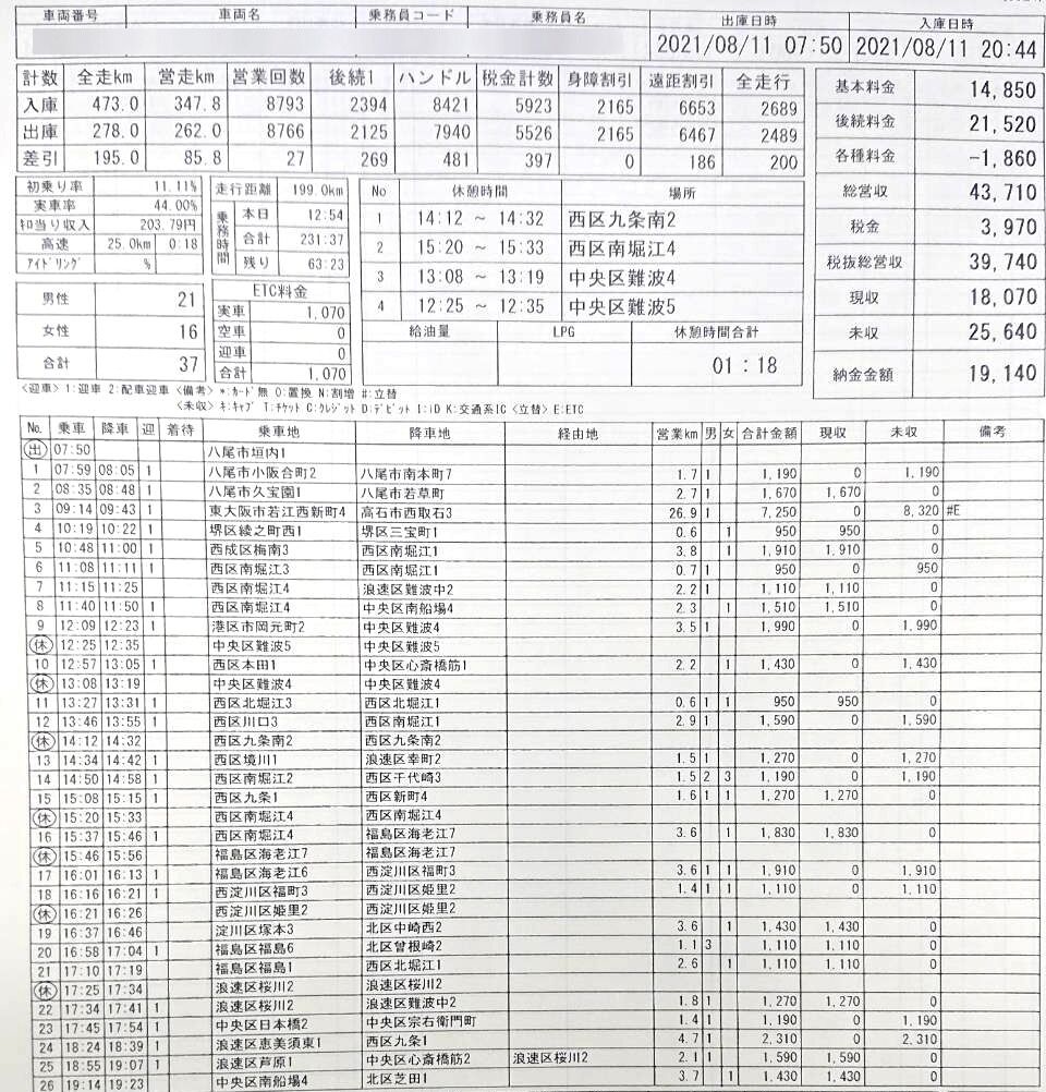 そんで夜勤のツッカン。約12時間営業で15組40,510円。通常の立ち回りとDiDi営業で良い結果を残してるなあ。彼の日報からは特に夜間の緊急事態宣言の影響は感じられへん。堂山もうまく使ってる。