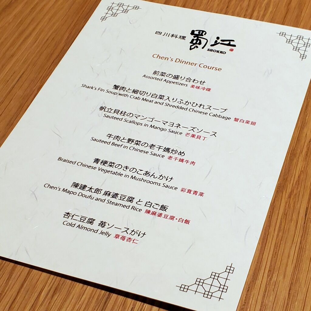 神社の夜間拝観の帰り道、ANAクラウンプラザホテル京都の四川料理 蜀江を一休レストランで予約してたんで行ってみた。『陳健太郎ディナーコース+1ドリンク』6,800円×2。ホテルは駐車場も完備されてて、やっぱりいい感じやね。
