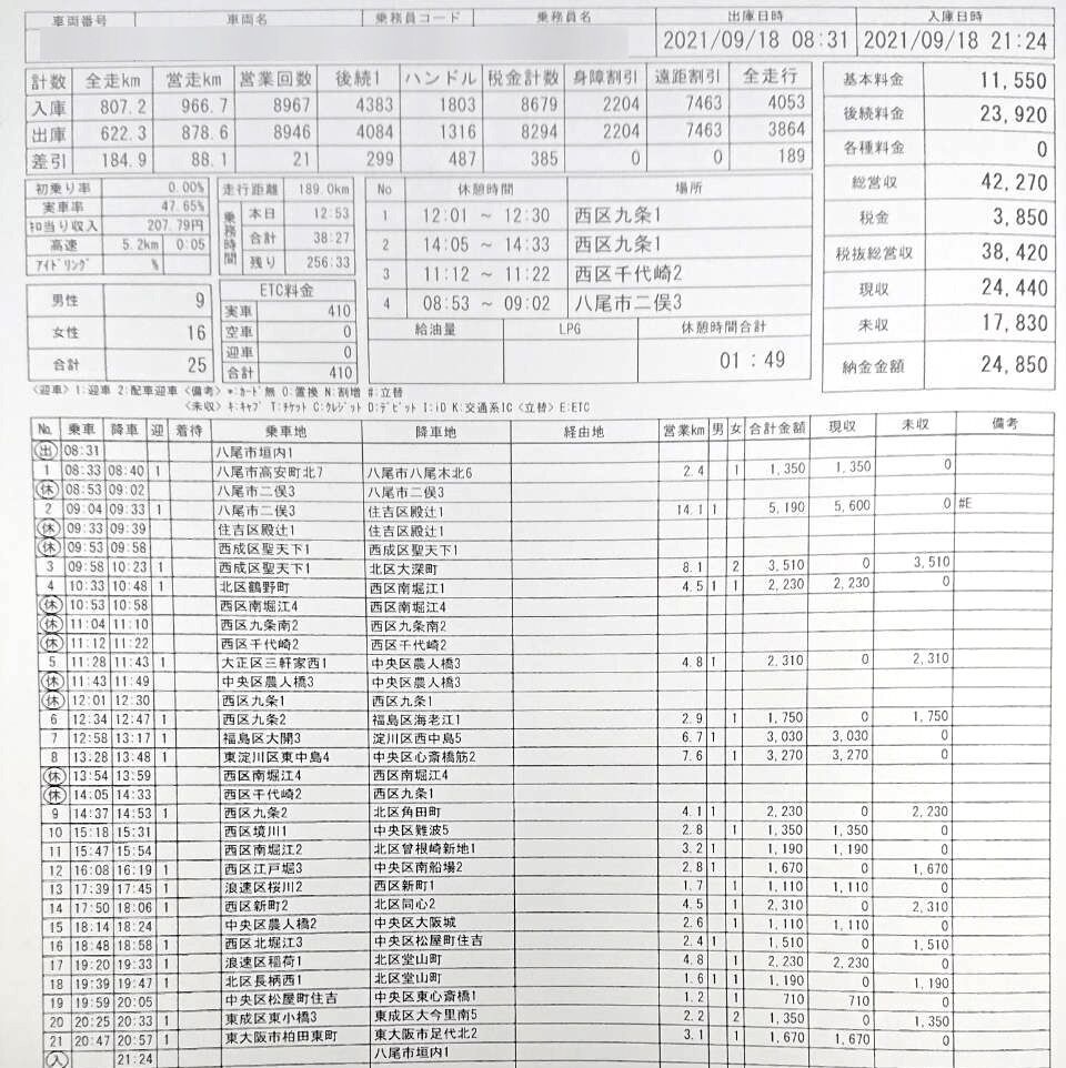 土曜日の大阪タクシー営業。今日から三連休やね。シルバーウィーク。21日(火)と22日(水)も休みにすれば、6連休になるワケやね。24日(金)も休めば実に9連休になるなあ。