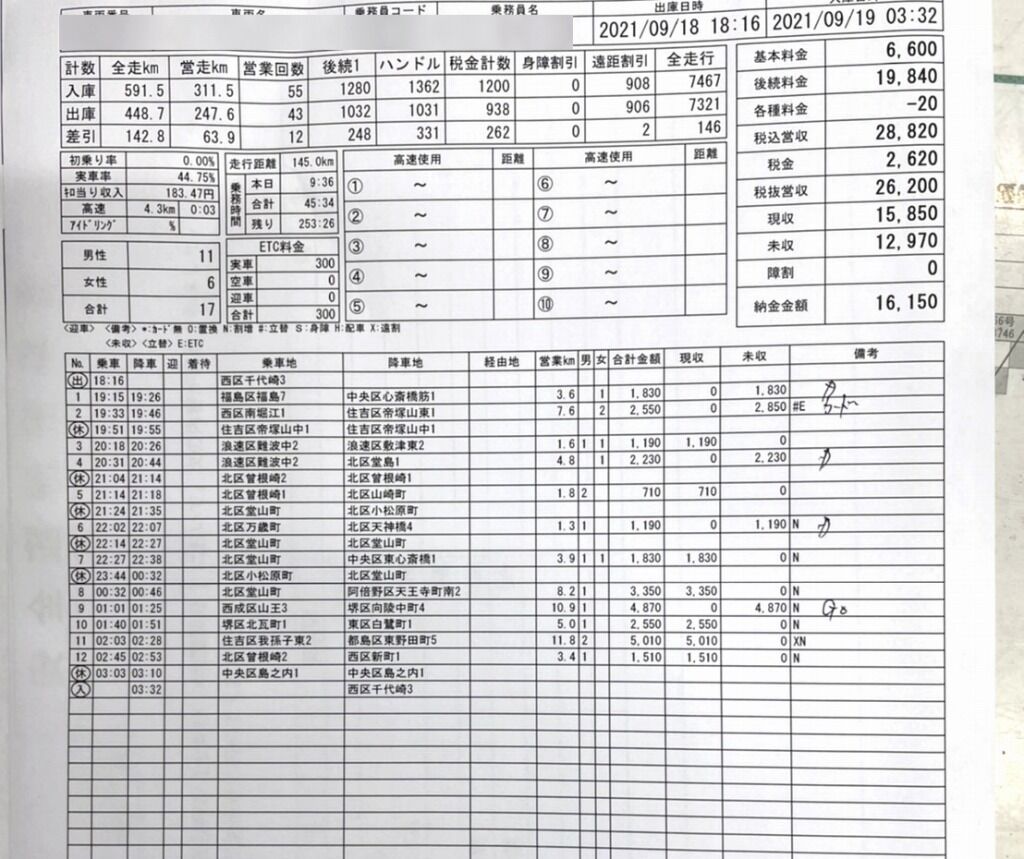 げ、撃沈・・・(笑)。メッチャタクシー多かった。こらあかん。退却やね。あかん日は帰る。5時間ちょいの営業で8組12,240円、チップが70円やった。累計が12,240円÷1=12,240円やね。他の人はこんなカンジ。