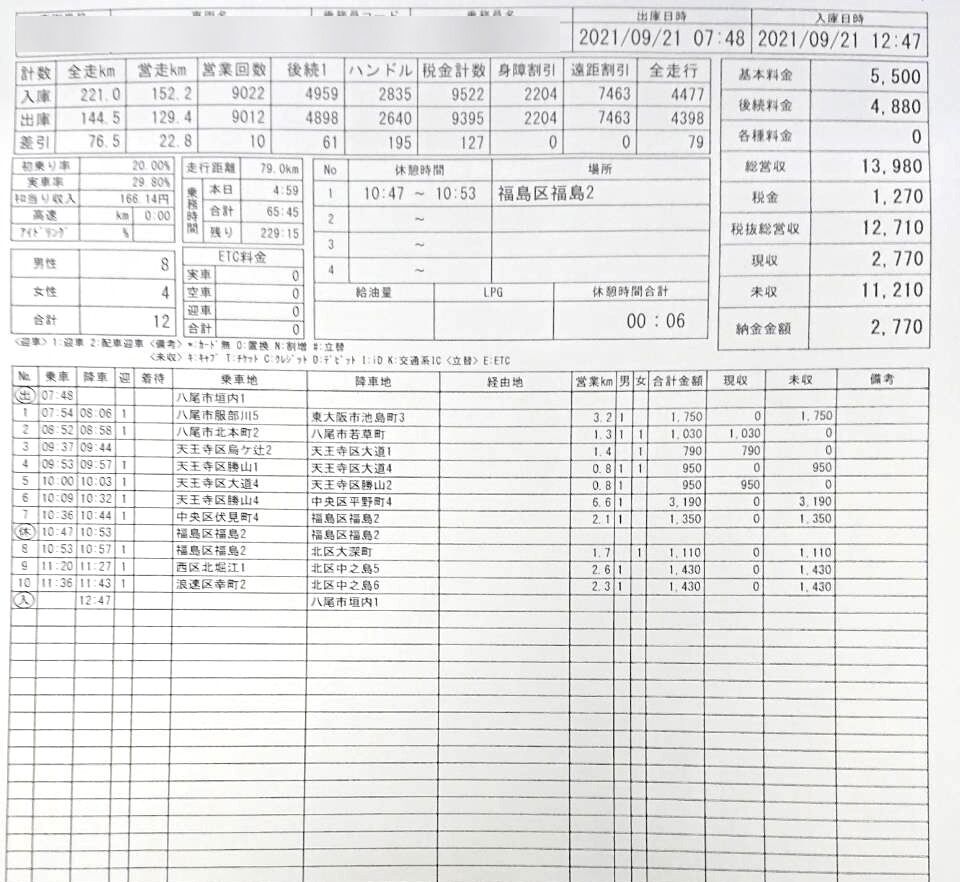 5時間勤務で10組13,980円。9組が実にDiDiという・・・(笑)。迎車料金なかったら1万円割ってるワケやね。やっぱり迎車料金有った方がワタクシはいいと思う。迎車料金有りでもこれだけ鳴るねんもんなあ。