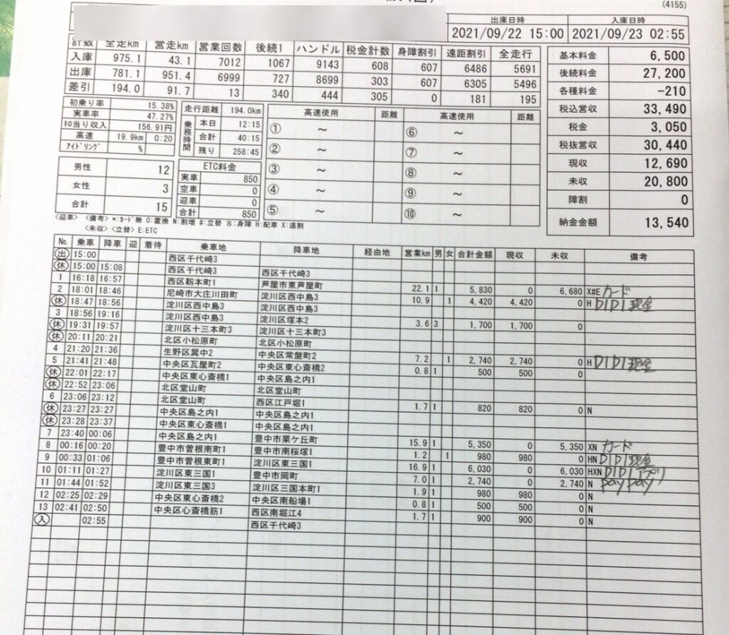 ドームのノニ兄さん。13時間勤務で13組33,490円。何とか踏ん張って3万超えを達成したみたい。なかなかキビシイ大阪タクシー業界。まあでも何とかなってる。