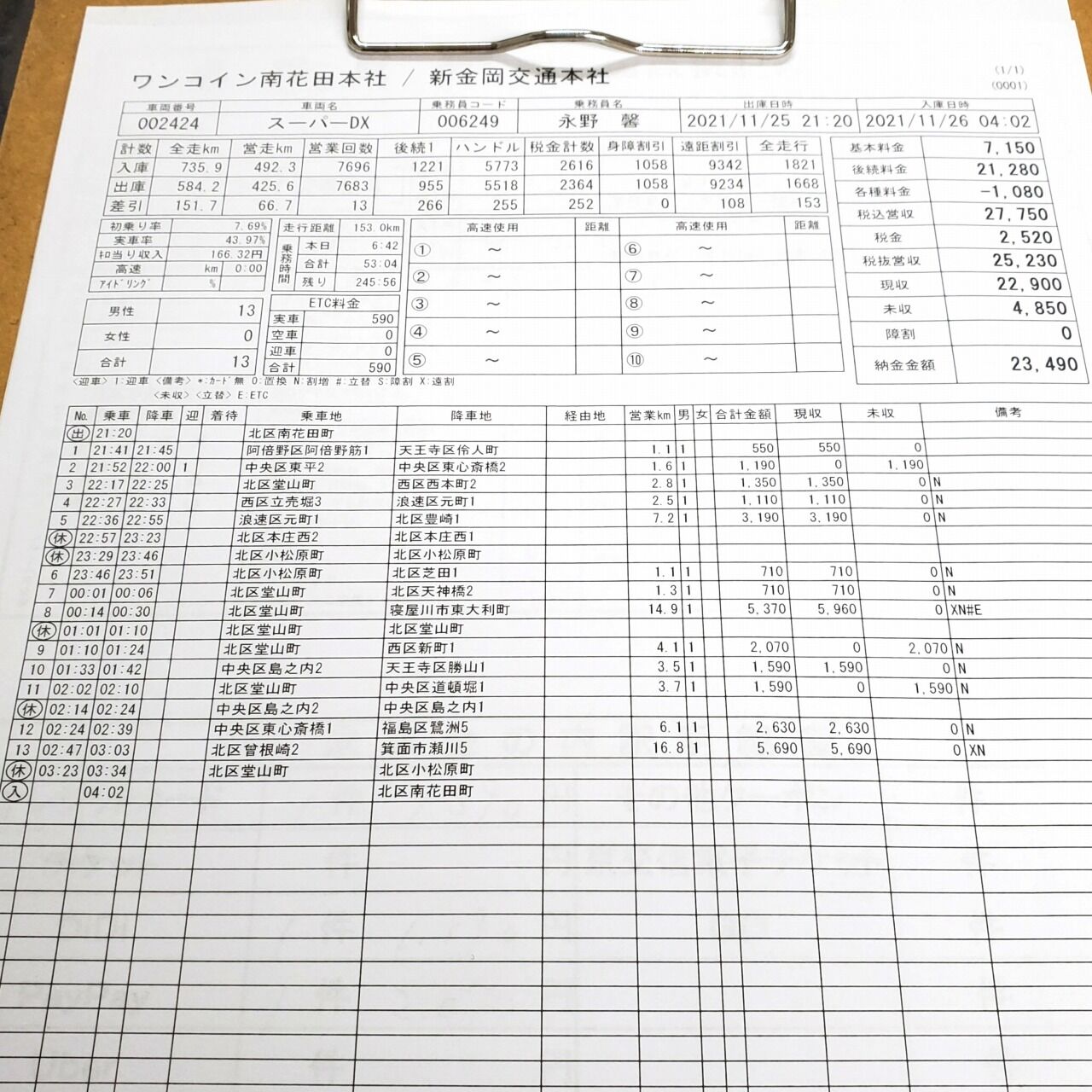 えーっと、21時20分出庫で4時2分帰庫の6時間42分営業。割増時間をフルに使うやり方。これがワタクシには合ってるし、こんなやり方があるっていうのを広めたい。1日4万5万オーバーのやり方は他のブログを参考にしてもらえばいい。
