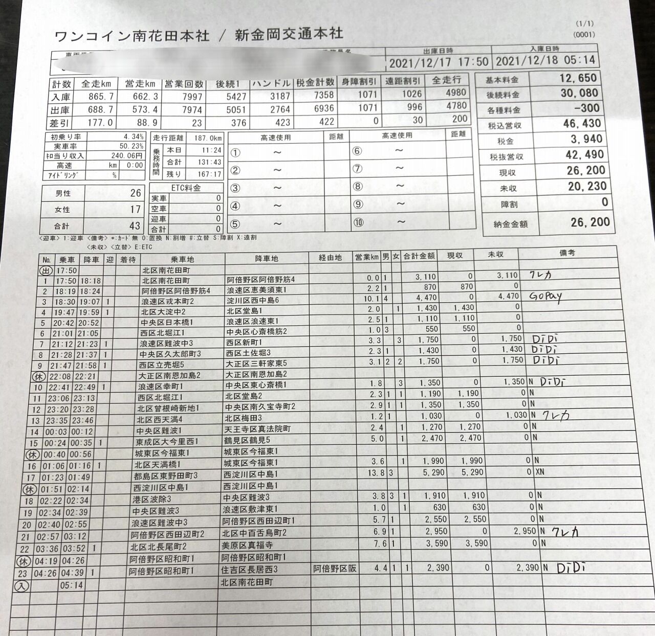約9時間半勤務の結果は、16組49,860円でチップが200円やった。累計は49,860円÷1=49,861円やね。DiDiは今日は搭載せずに営業してみた。忙しい時はこの方が振り回されなくてやりやすいかも。まあ後々の事を考えると、いつも通りDiDiを取る方がいいかもしれん。それは個人の選択やね。