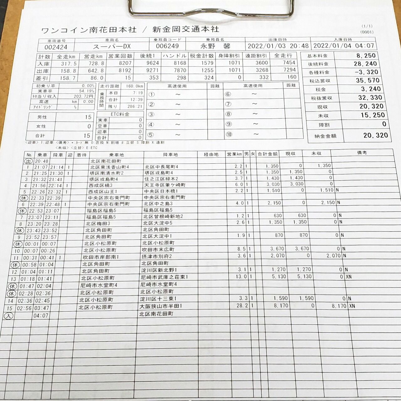 さすがに昨日のようにうまくは行けへんかったけど、7時間20分ほどの営業の結果、15組35,570円でチップが20円やった。累計は151,260円÷4=37,815円やね。