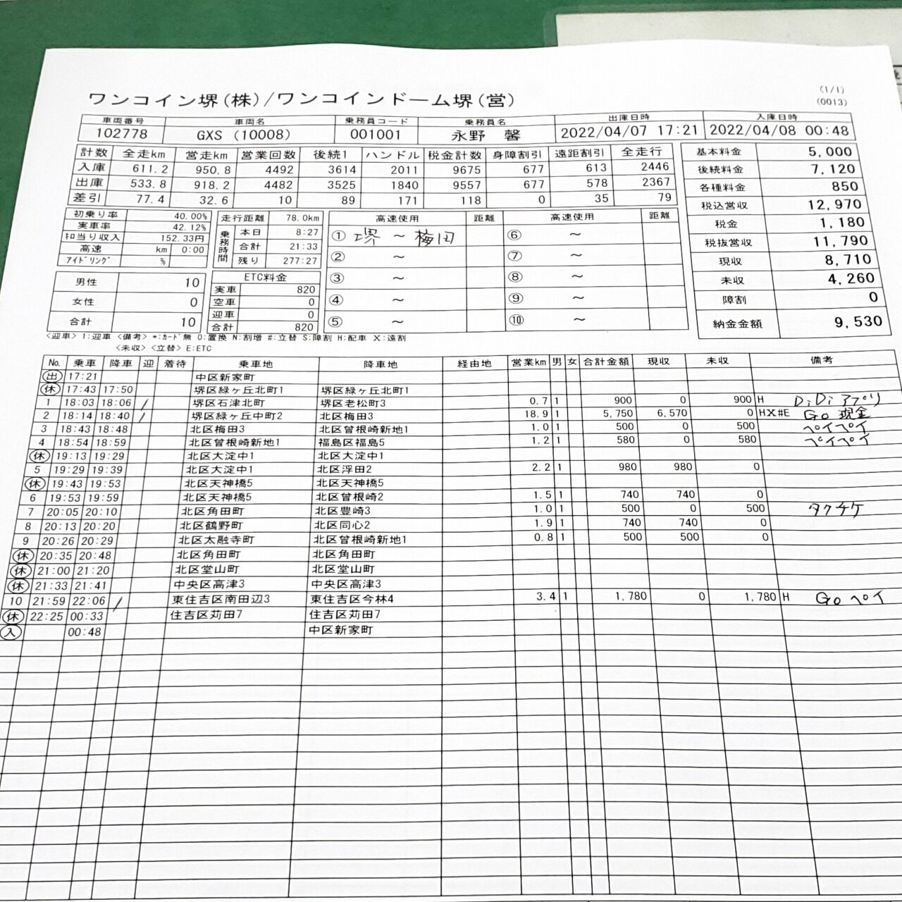 7時間ちょいの営業で10組12,970円、チップが0円やった。累計は65,800円÷3=21,933円やね。今日はあかんかったなあ。まあこんな日もあるからタクシーはオモロイ・・・♪