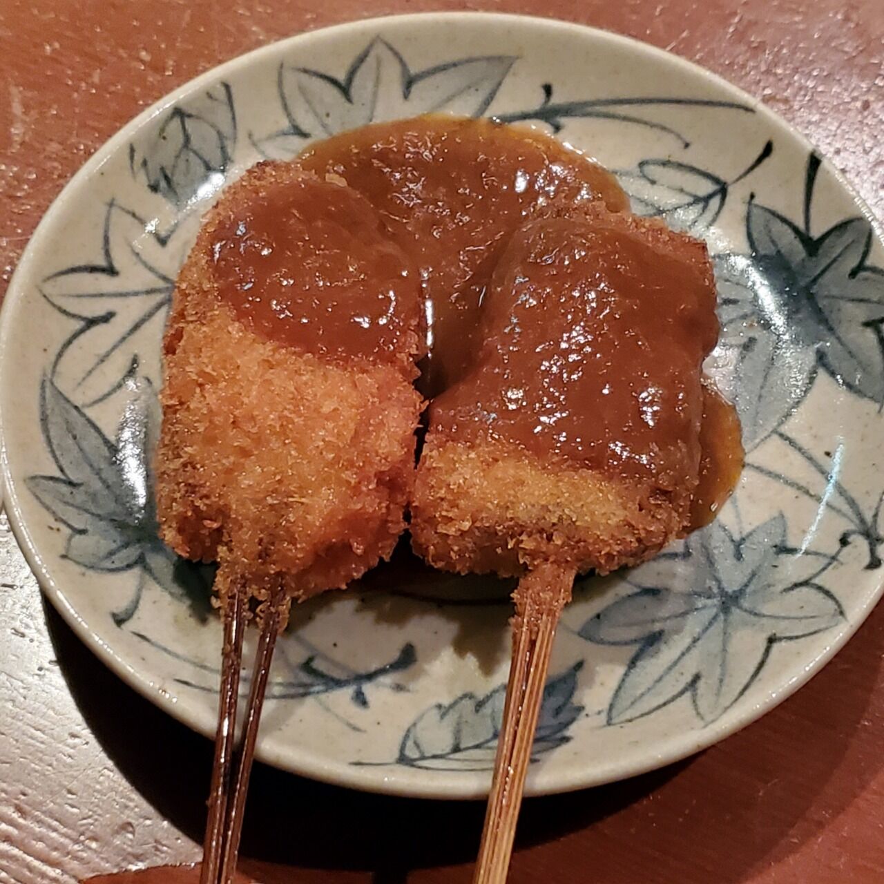 いやぁ・・・、メッチャ良かった。やっぱり情報は大事やね。サクッと軽く揚がってる。串カツと串揚げ、どっちもいい。串揚げはちょっと上品なカンジかな。ここは串揚げやね。1人5~6,000円ぐらい。味を考えると実にリーズナブルやと思う。