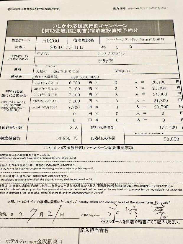 北陸応援割を利用してスーパーホテル金沢駅東口を予約。3人5泊3部屋朝食付きで107,700円→53,850円でオッケー♪ それぞれ別の部屋で朝食と温泉もあって、これは安すぎる・・・!!